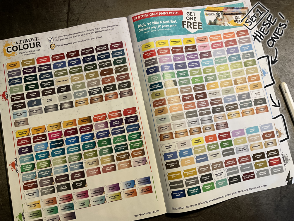 Trying to make pallets based on all the Warhammer paints was an absolute mistake. Here’s a day's work, not the full set, but a pretty large amount as it is. I plan on doing the rest at a later date. Colours were sampled directly from the Citadel Colour phone app, the magazine in the photos was just an inspiration.